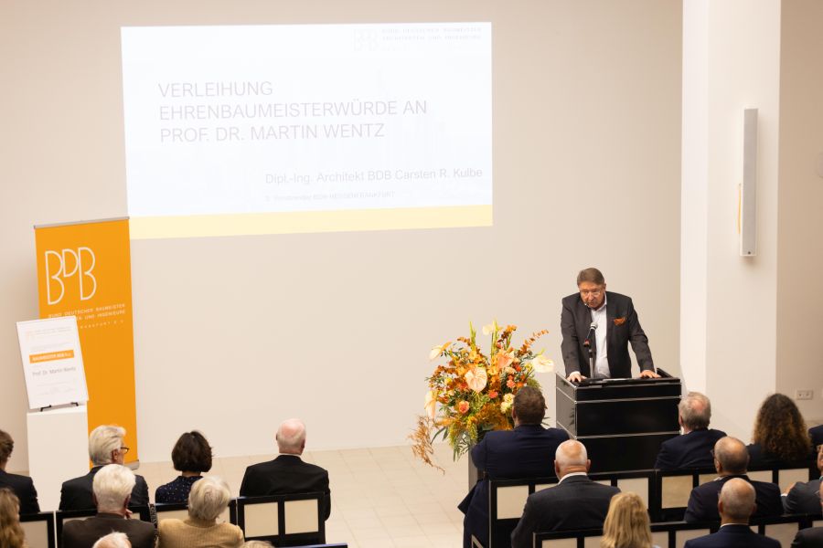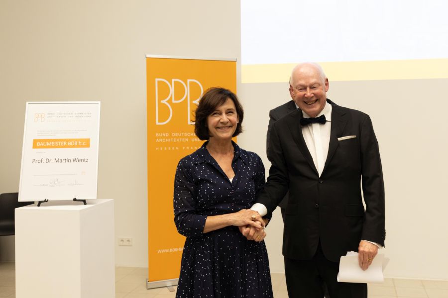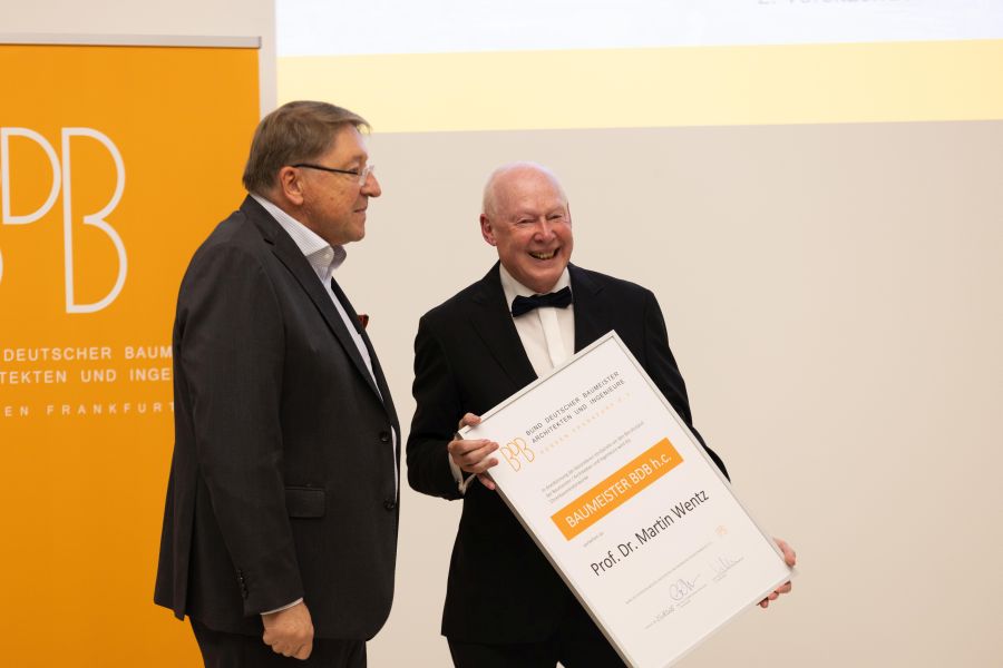 In feierlichem Rahmen hat der Bund Deutscher Baumeister Hessen Frankfurt e.V. (BDB) den Titel Ehrenbaumeister BDB h.c. an Prof. Dr. Martin Wentz verliehen.